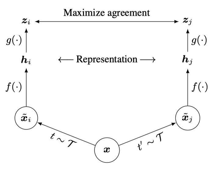 SimCLR 整体框架如下,和目前其他的方法是一致的