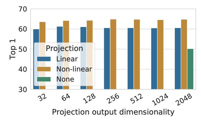 可以看出,直接使用 global average feature 效果是最差的,而一个 non-linear head 有着最好的效果。