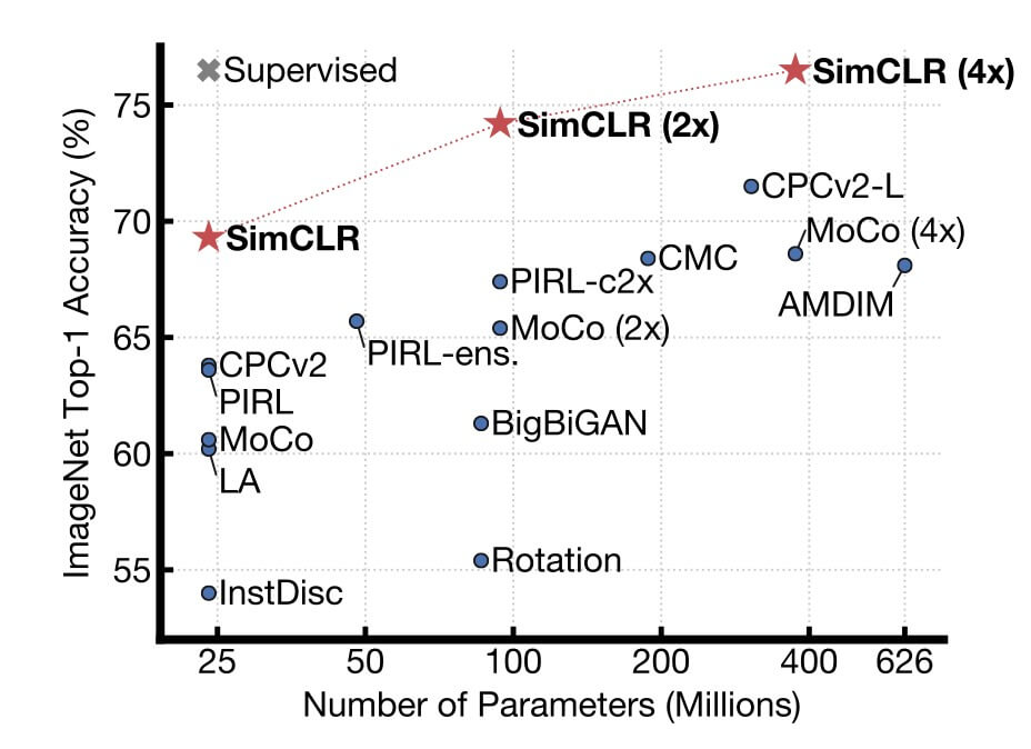 这篇文章是 Hinton 团队出品的,主要做的是目前炙手可热的领域,self supervised learning, 提出了一个简单的框架来解决 visual representation 中的 contrastive learning。 其实前两个月 kaiming 团队也提出了一个叫 MoCo 的方法来解决这个问题,这篇文章总体思路和 MoCo 几乎一样,最大的 contribution 我认为是去探索了框架中的每个部分分别对最终结果的影响。 最后根据论文的发现,作者调出了目前最强的结果如下,点数非常高。
