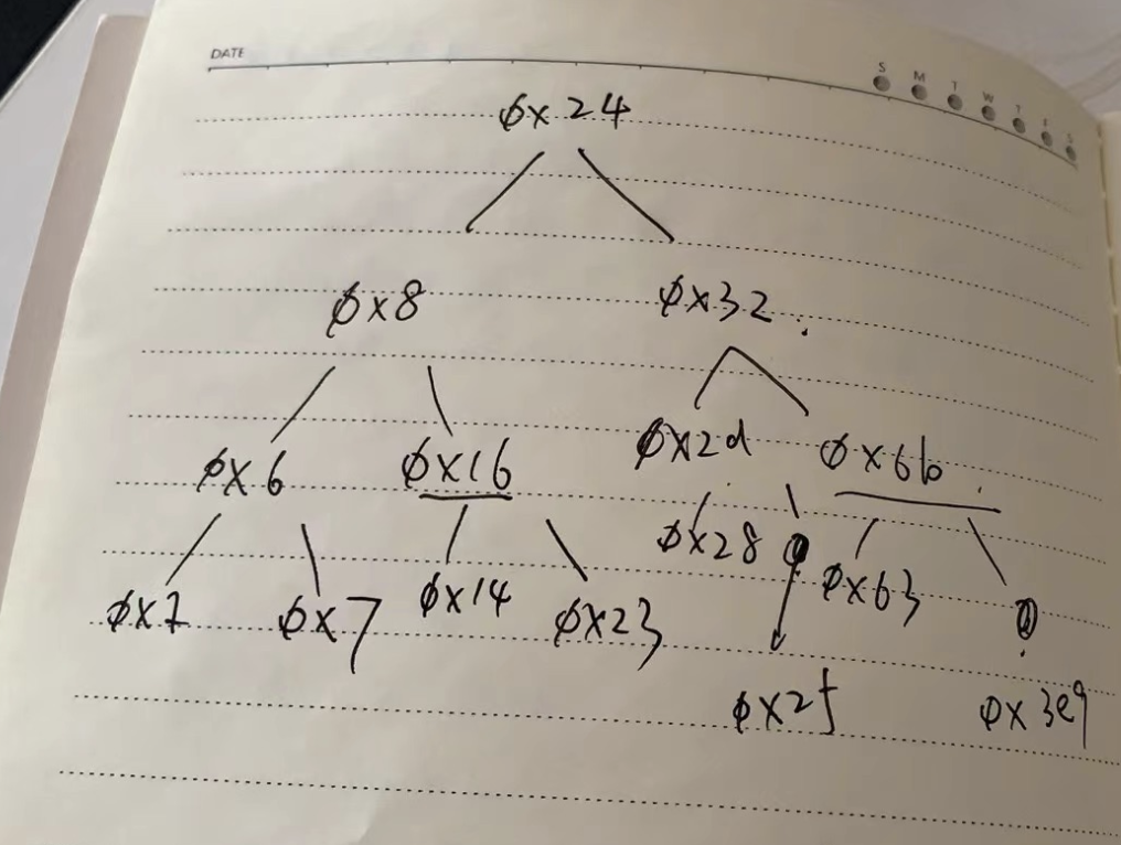 下面分析一下函数递归调用前的行为,发现有这两个地方 mov 0x8(%rdi),%rdi 和 mov 0x10(%rdi),%rdi,通过 gdb 去查看 $rdi 地址所指向的内容 x/24 $rdi,会发现这是一个二叉树,第一个是节点的值,后面分别是左子树和右子树的地址。