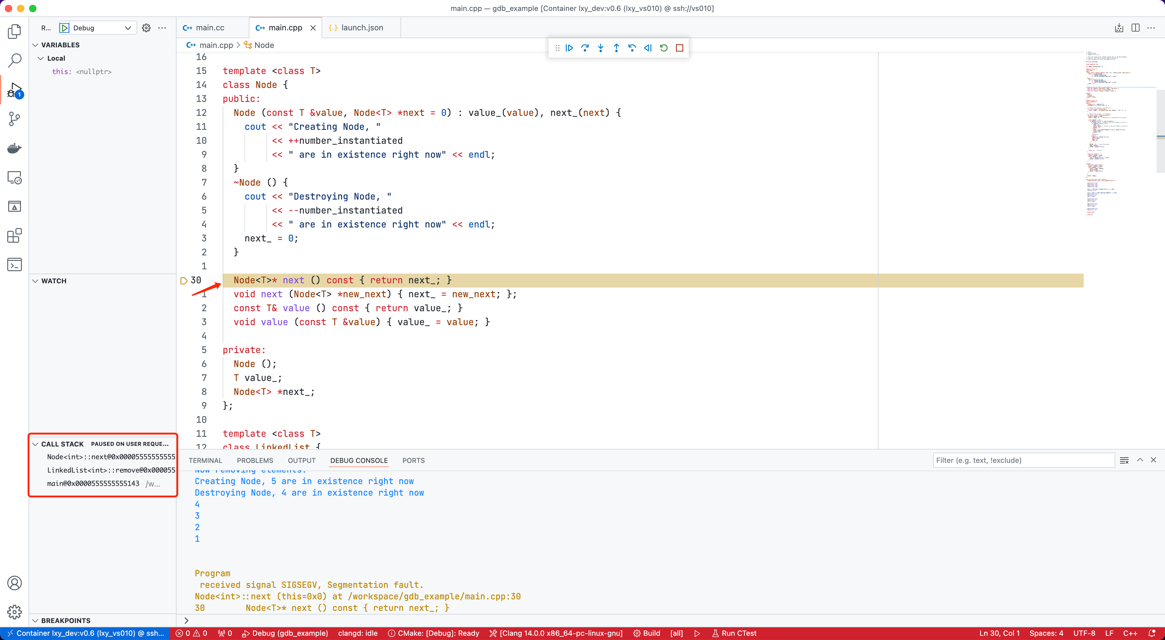 按下左边的绿色箭头或者是 F5 程序就可以运行了,提前在对应的 C++ 中打上断点,程序最终会在断点位置停下来,然后可以进行单步调试或者是使用 gdb 中的命令在 console 中进行想要的操作,非常方便。