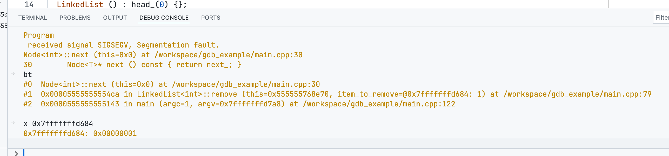在下面 console 中可以输入 gdb 的命令进行调试,比如下面我们访问 backtrace,然后访问地址 0x7fffffffd684 对应的元素,最后发现 linked list 在移除 1 的时候出现异常。