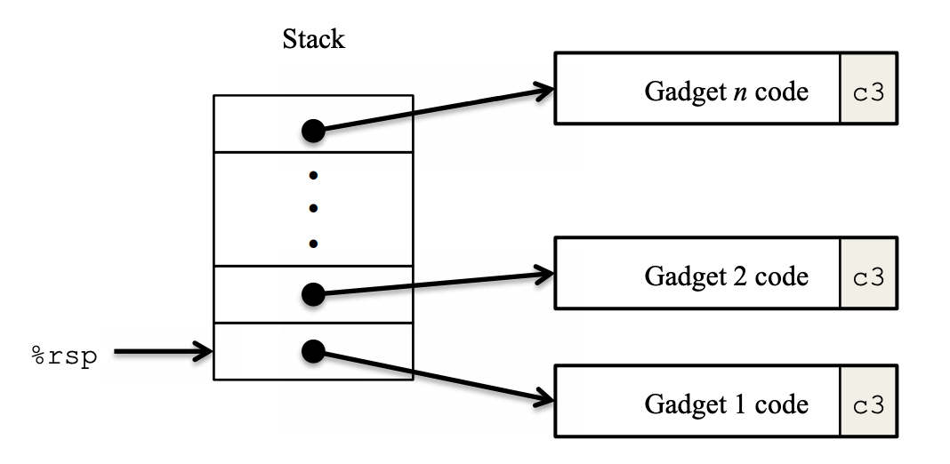聪明的程序员发现可以通过执行代码中存在的片段而不是插入代码来实现攻击,最通用的方式叫做 return-oriented programming(ROP),这种策略通过识别存在于程序中 ret 字节序列中的一个或多个指令,这些片段叫做 gadget.