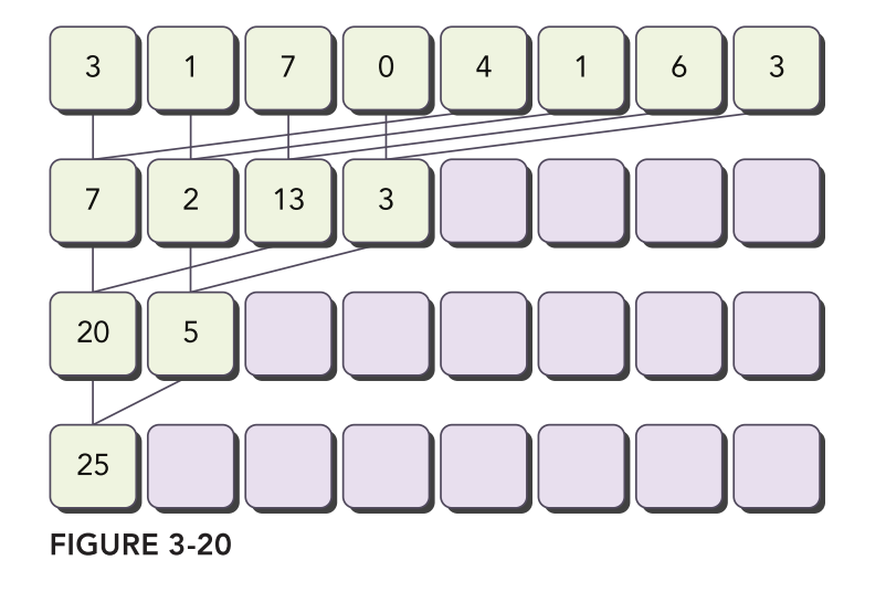 这种方式对于大型数组来说,效率是很低的,为了加速这个过程,并行计算是必不可少的。对于加法来说,它满足交换律和结合律,所以按照任何的顺序对数组进行求和都是可以的。