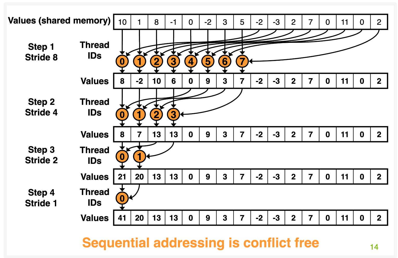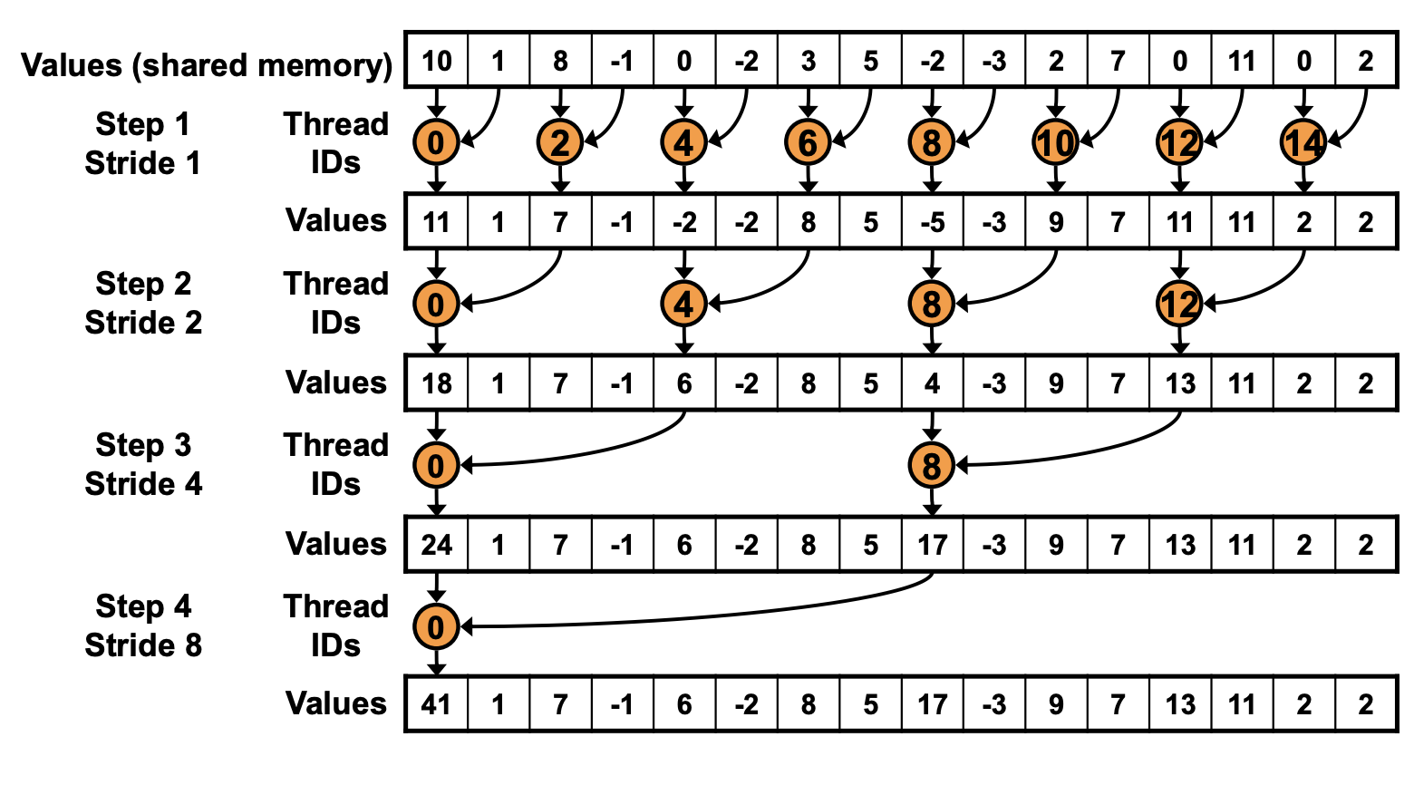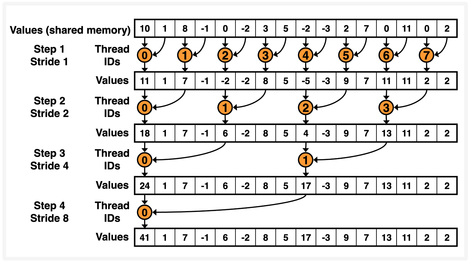 采用这个方法,整个 array 会被分到不同的 cuda block 中,每个 block 中的线程会找到对应的元素执行 reduce 操作,不断循环这个过程。比如第一次 idx=0,2,4... 按照 stride=1 去找到对应的元素执行 reduce,第二次 idx=0,4,8 找到 stride=2 的元素执行 reduce,参考代码如下: