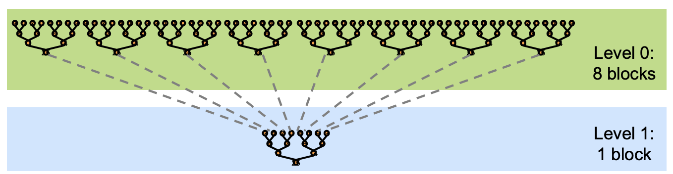 采用 kernel decomposition,多次 kernel launch 执行的是相同的代码,所有 level 都是一致的,kernel 被递归调用。 输入的 array 被分成多个 chunks,每个 cuda block 都负责处理其中一个 chunk 的 partial sum 结果,可以参考下面这张示意图。