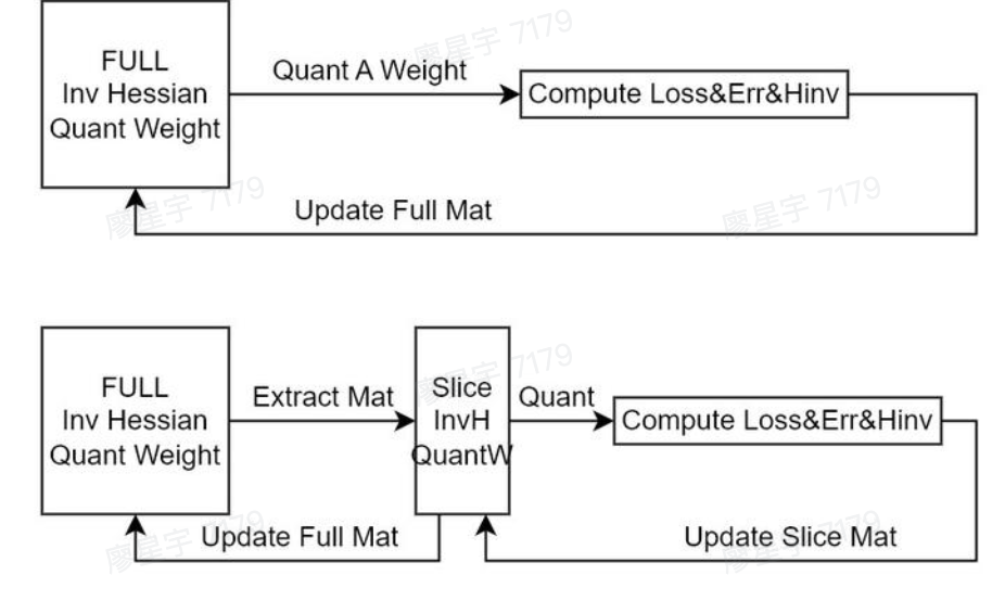 $$ \mathbf{w} \leftarrow \mathbf{w} - \frac{w_q - \text{quant}(w_q)}{[\mathbf{H}^{-1}]_{qq}} \mathbf{H}^{-1}_{:, q} $$This lead to a relatively low compute-to-memory-access ratio. For example, if the weight matrix is $\text{k} \times \text{k}$ and quantizing is done along columns, the total memory-access IO is $\text{k}^3$.