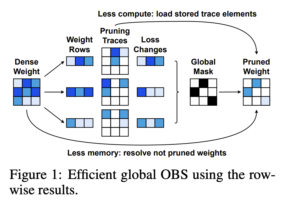 $$ E = \sum_{i=1}^{\text{d}_{\text{row}}} ||\textbf{W}_{\text{i}, :} \textbf{X} - \hat{\textbf{W}}_{\text{i}, :} \textbf{X}||^2 $$With this formulation, pruning can be carried out along each row independently. If $k$ parameters are pruned in in each row $\text{d}_{\text{col}}$, the time complexity can be reduced to $O(\text{k} \cdot \text{d}_{\text{col}}^2)$.