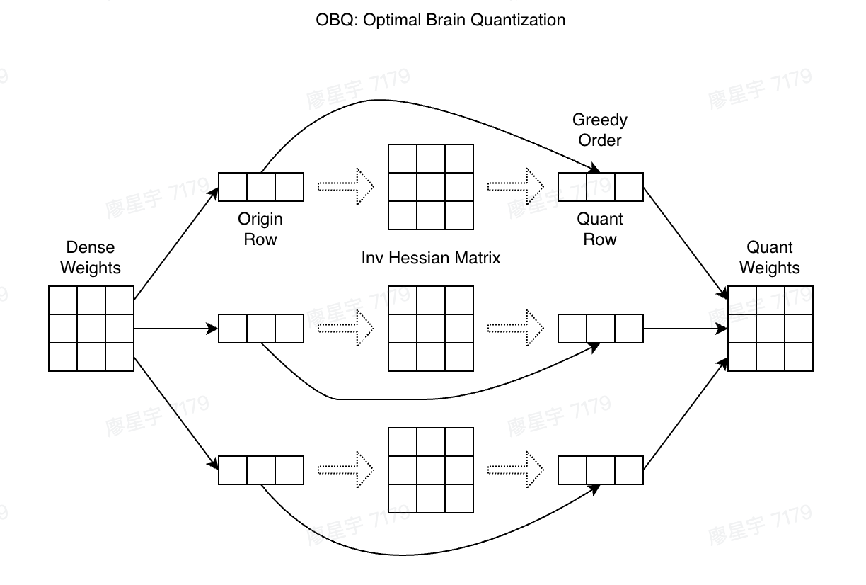 $$ \delta \mathbf{w} = - \frac{w_q - \text{quant}(w_q)}{[\mathbf{H}^{-1}]_{qq}} \mathbf{H}^{-1} \cdot e_q $$$$ \delta E \approx \frac{1}{2} \frac{(w_q - \text{quant}(w_q))^2}{[\mathbf{H}^{-1}]_{qq}} $$In the same way as OBC, quantization for each row can be carried out independently. The time complexity is $O(\text{d}_{\text{row}} \cdot \text{d}_{\text{col}}^3)$ since all parameters needs to be quantized.