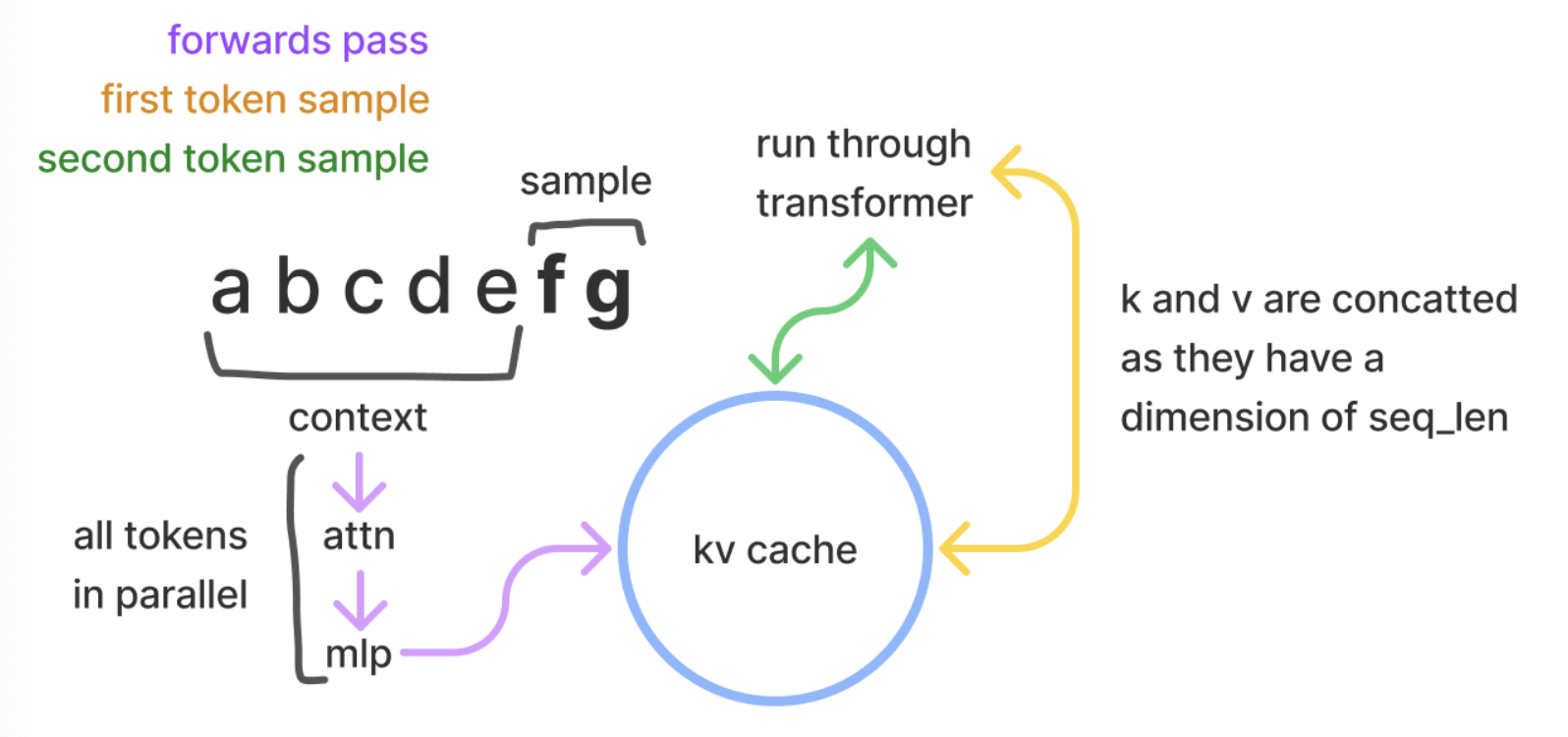 During the sampling stage of transformer inference, there’s a prefill phase (which can occur in parallel) followed by the generation of additional tokens sequentially. Both during prefill and token generation, self-attention is executed, necessitating kv values for each item in the current sequence. These vectors are housed in a matrix referred to as the KV Cache or past cache, typically structured as [batch, seq_len, 2, num_head, head_dim].