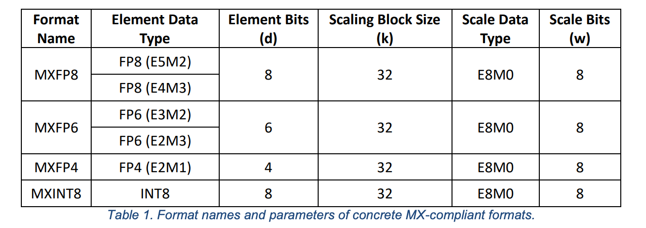 在 2023 年 9 月,几家芯片大厂(NVIDIA、AMD、Intel 等)联合发布了一个 MX‑format 的技术报告,这个技术报告中定义了 MX‑compliant format,其包含下面三个组成部分:
