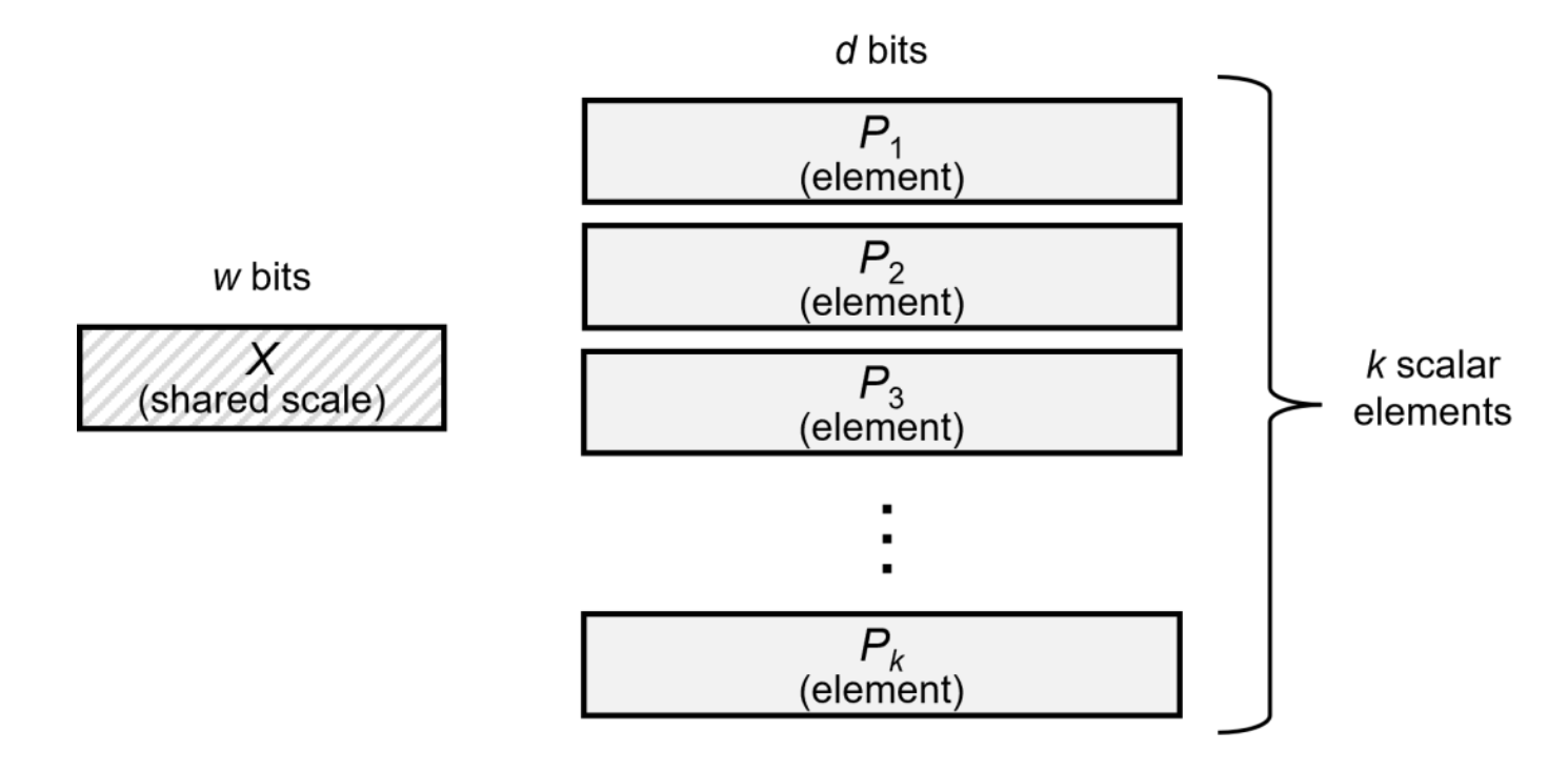 其中 $P_1, P_2, \dots P_k$ 就是一个 block 中的所有 elements,每个 element 都是 d bits,其共享同一个 scaling factor X。