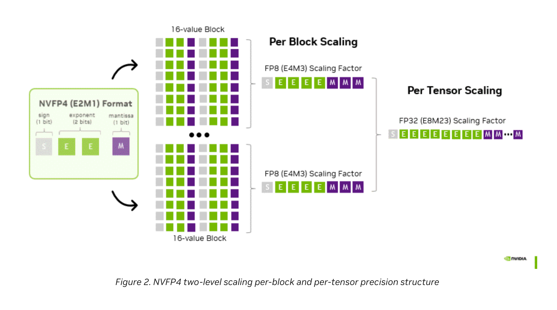 上面提到的 MXFP4 格式由于采用了 FP8(E8M0)作为 scale dtype,所以在精度上存在明显的缺陷,而精度是量化里非常重要的一个考虑因素。因此,NVIDIA 在一篇博客里提出了一种新的 4‑bit 格式——NVFP4。